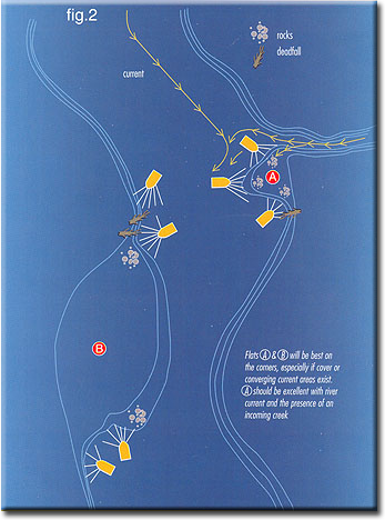 Migration is truly a way of life for these fish. Finding a concentration of muskies in one location today does not guarantee a single follow tomorrow. To consistently contact fish in a system, developing an evolving knowledge of holding points for migrating fish is essential. In most southern and midwest reservoirs, flats are both a sanctuary and an obstacle for muskies on the move. Rapidly falling water during winter drawdown forces muskies to travel long distances to wintering areas very quickly. On Buckhorn Lake, these fish often must travel 75 miles or more in a few short days. Flats still underwater must be either crossed or gone around, slowing progress to safer water. Forage fishes often use flats extensively for feeding areas and refuge, attracting predators. Muskies relocating from one area to another feed on the flats and hold on key areas, often for some time before moving on. On deeper flats that drop off abruptly close to shore then level out at 20 or 25 feet or so, muskies often suspend near baitfish, usually over the breaklines or edges of the flat. On tapering flats that run hundreds of yards before reaching these depths, muskies can suspend much farther from shore over the same depths. Most likely, though, if flats start off shallow and taper gradually, the corners of the flats are the key areas. Corners of flats are formed when the river or creek channel running around the periphery of the flat bends back into the shoreline, forming the upstream or downstream endpoint of the flat. Top of maps makes these areas easy to find (fig. 1).